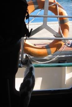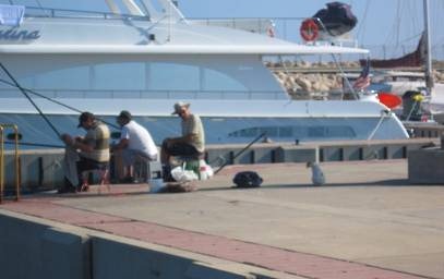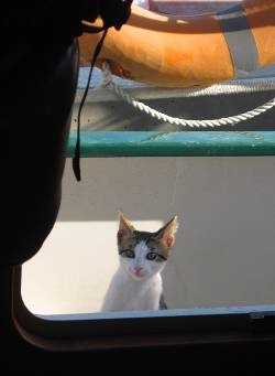 About 10 am this morning a small boat pulled up across from us. Lots of pre and young teens and some adults unloaded lots of picnic supplies, pool toys, etc. Even a rubber baby pool. Randal and I were working on our dinghy which had become unglued. We had the shell and the pontoon but they weren’t stuck together. Randal was laying down some stuff like sikaflex on both pieces and then we would put them together and let it set. It was not so easy to do and with kids walking by every 2 seconds unloading stuff…… Anyway, the dinghy got glued, no problem. Eve made a sign in Hebrew that asked people not to touch the dinghy. Randal put some heavy bricks on it to press the pieces together and wrapped rope around. We also tied the whole thing to the cleat on the dock. Hopefully it will work. With all of the kids running around in the area no one bothered the dinghy. We stopped worrying about it and went off to the grocery store that stays open on Saturday. The kids were noisy and energetic and in and out of the water all day; but everyone seemed nice. Past Saturdays there has been older kids drinking and being rowdy. Some took a discarded table top from Big Boat Karina and threw it into the water to float on. A security guard came and took the board and kicked them out. Technically you’re not supposed to be in the boat area unless you have a security key. That’s true of all marinas. The people visiting this Saturday were just fine. The small kitten wasn’t so thrilled with it all and stayed hidden most of the time. It did ask for food at one point and I fed it. (It had already eating a morning meal.) About 6 pm I heard a horrible meow that sounded like it was coming Davy Jones Locker; all echo and watery. Everyone went looking. The men in the big orange dredging boat; all of the picnickers, Randal and me. We found the kitten not where it should be. It was hanging on a tire the dredging boat was using as a fender. I went to get Randal and our look wood boat hook the kitten could cling on to. Somehow before Randal got there the kitten ended up in the water. And then just quiet. Randal and I were afraid that she had drowned. But then there she was swimming towards Eve’s dock. When she swam close enough to one of the boats near Eve’s a man grabbed her by the tail and flung her onto the dock! Whew. Everyone was smiling and happy…just because of one tiny kitten. Nice people. Russians I guess because it sounded like they were speaking Russian and not Hebrew. The kids could speak some English. Now it’s quiet. Hopefully it will stay that way. Big boat Karina played music way too loud, way too late last night.