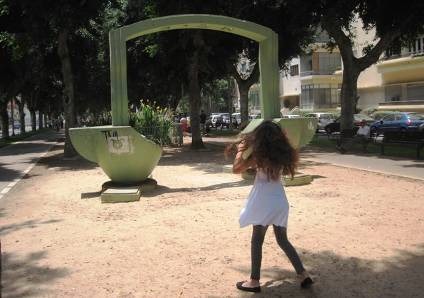 The beach promenade has lots of kitsch sculptures but they’re fun. The street promenade has more serious sculptures. I’m not sure what the sculpture, paid for by French Ashdodians, is supposed to be, but the graffiti doesn’t help.