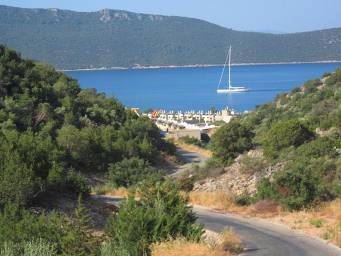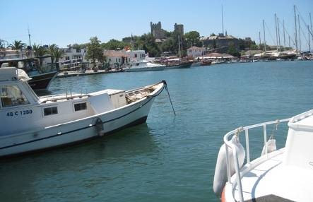 We are now back from Bodrum after a long, full, 24 hour passage. We were put back in the water at 11 am Monday morning. But had we started out then for Marmaris we would have arrived about 11pm, too late to do anything but anchor out and wait until morning to enter the marina. Instead we dropped anchor in Bodrum and waited around. But that was just too hot and boring so we pulled up anchor and hoped for slow speeds that would get us to Marmaris about 8 am. No such luck. Even with the throttle cut back we zoomed along at over 7 knots. By 8 pm we knew our plan wasn’t working so well so we found a bay that looked somewhat sheltered from the 24 knot winds and we went in and dropped anchor. We would wait there and rest for 4 hours, pull up anchor at 1 am and head for Marmaris planning to be there about 8 am when the marina staff would help us into a berth and before the wind would pick up. We’d had our anchor drag back in Bodrum and then again the first try in this bay. So though we really were good and stuck the second attempt, we took turn standing watch to make sure we didn’t drift back into the island behind us. Randal took the first watch from 9 until 11 and then I watched until 1 am when we pulled up anchor and were on our way. The thing about standing watch at anchor is that I could read so it wasn’t so boring. When we’re moving there is too much movement to read and too much to watch so reading isn’t such a good idea. I know people who listen to audio books or can read, but we haven’t had smooth enough crossings of late to make reading possible. I do read during the day unless we’re really rolling and then even I get queasy looking at print. As it happened, beware of what you wish for…those earlier wishes for slower speed caught up with us when we didn’t want them, the wind increased and we bounced our way towards Marmaris averaging less than 5 knots for too many hours. There was a full moon so that was nice and by sunrise, my watch was from 4 am to 7 am, I was wide awake enough to let Randal sleep until 9 am. We finally arrived in Marmaris Bay and though it was still windy, the bay helped as did the marina walls so we got into our berth without incident with the help of the marinaros. Marinaros are the men in the small, powerful dinghies who lead you to a berth, push the bow and stern around with their dinghy, hold you in place and then handle your lines on shore and hook you up to the bow line. Good guys.