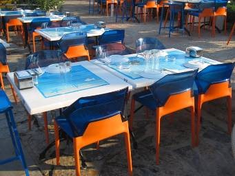 (Our dinners were eaten indoors with AC and paper place mats advertising something I should remember, but don’t.)
