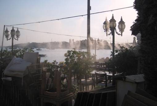 This cooling mist looks like fog. The Bodrum Castle is ghostlike in the distance.