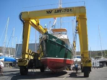 Once the lift straps were in place, removing the tiny stands that look too impossibly small to hold up a 34 ton boat. But those straps look pretty puny too, except in real live they are rather larger looking. The stands look as puny in real life as they do in the photo.
