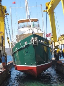 Photos of us going back into the water. It would be easy to confuse the coming out with the going in except for the beautiful bottom paint you can now see where before it was pretty grungy.